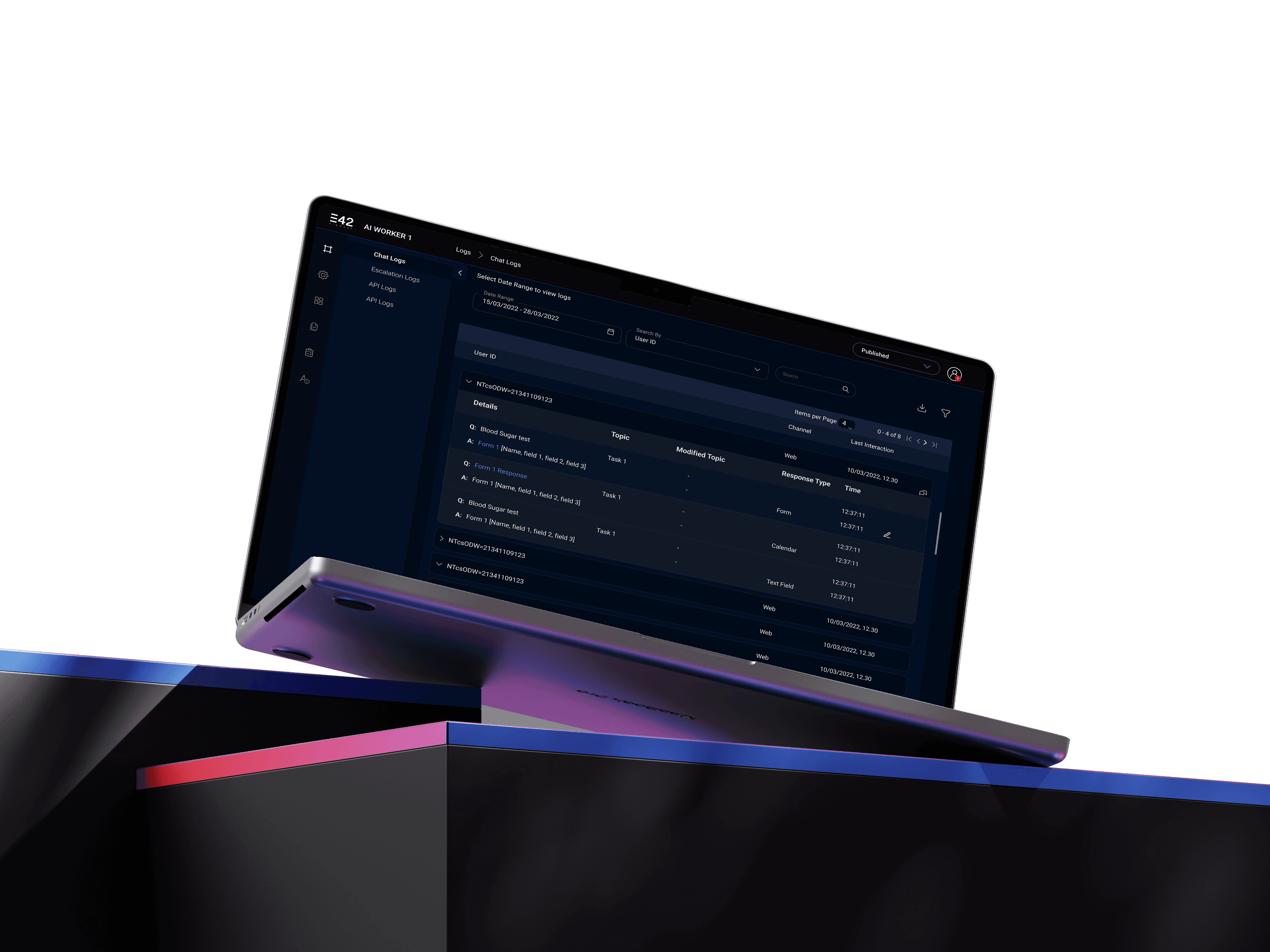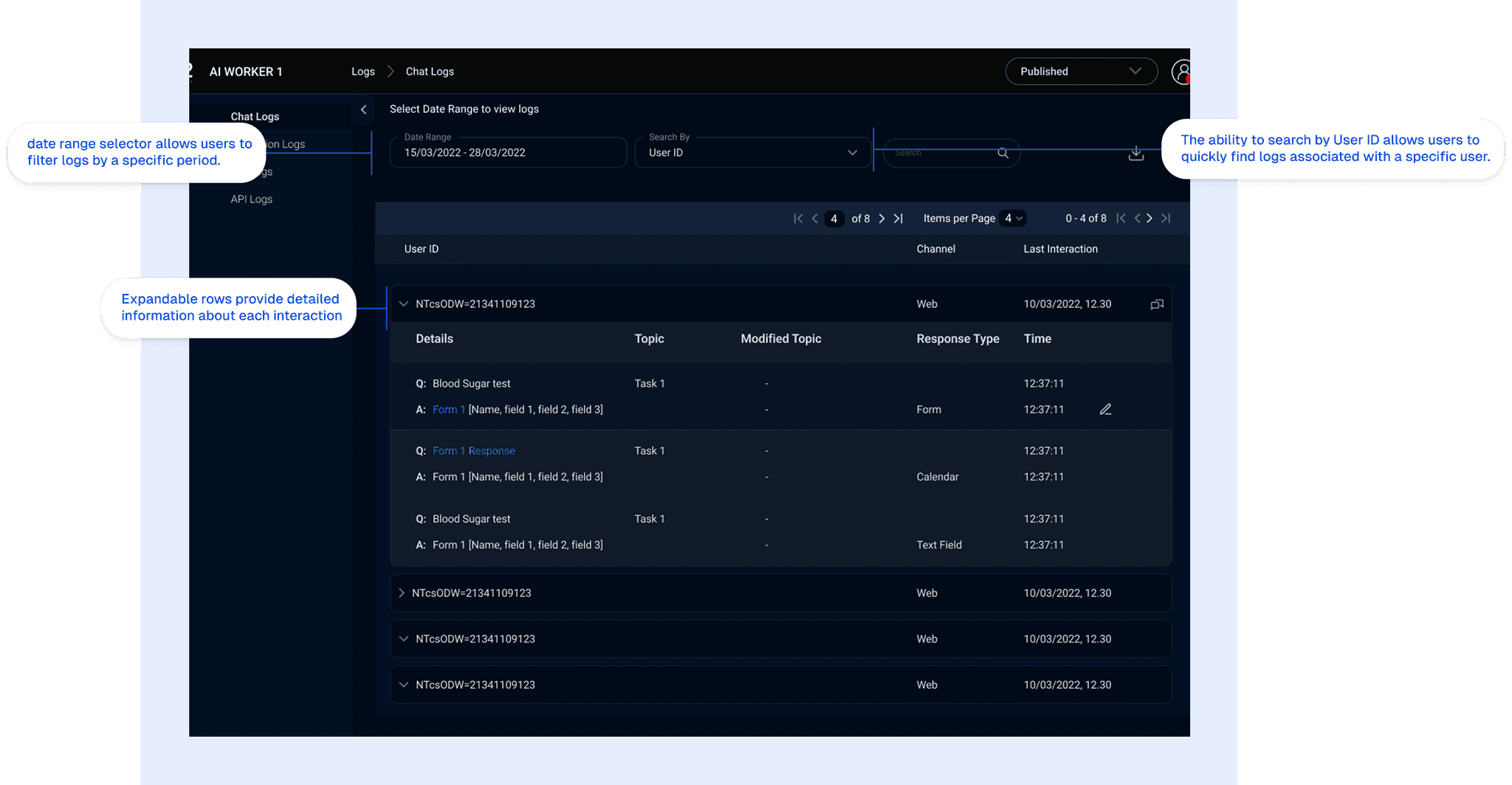ELI5: This screen shows what people are saying to the computer. It’s like a record of all the conversations. You can find the chats you are looking for, by date or by the user who had the conversation.