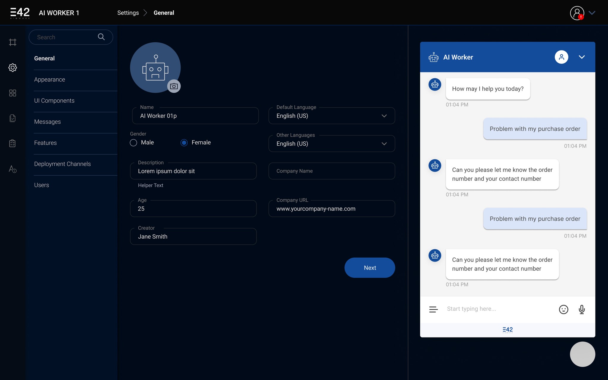 The E42 AI Worker screens showcase a versatile interface designed for enterprise cognitive process automation. Through a conversational AI format, users interact with an AI assistant capable of handling various tasks, from addressing customer inquiries to managing internal workflows. The screens display multiple functionalities, including quick-reply options, data visualization through charts (e.g., yearly sales reports), media integration, and task management features like calendar scheduling.