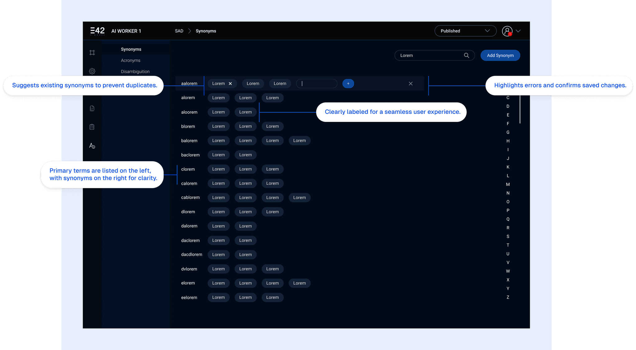 Goal: To create an intuitive interface for managing synonyms, acronyms, and disambiguation within the AI Worker system. This screen focuses specifically on synonyms.
