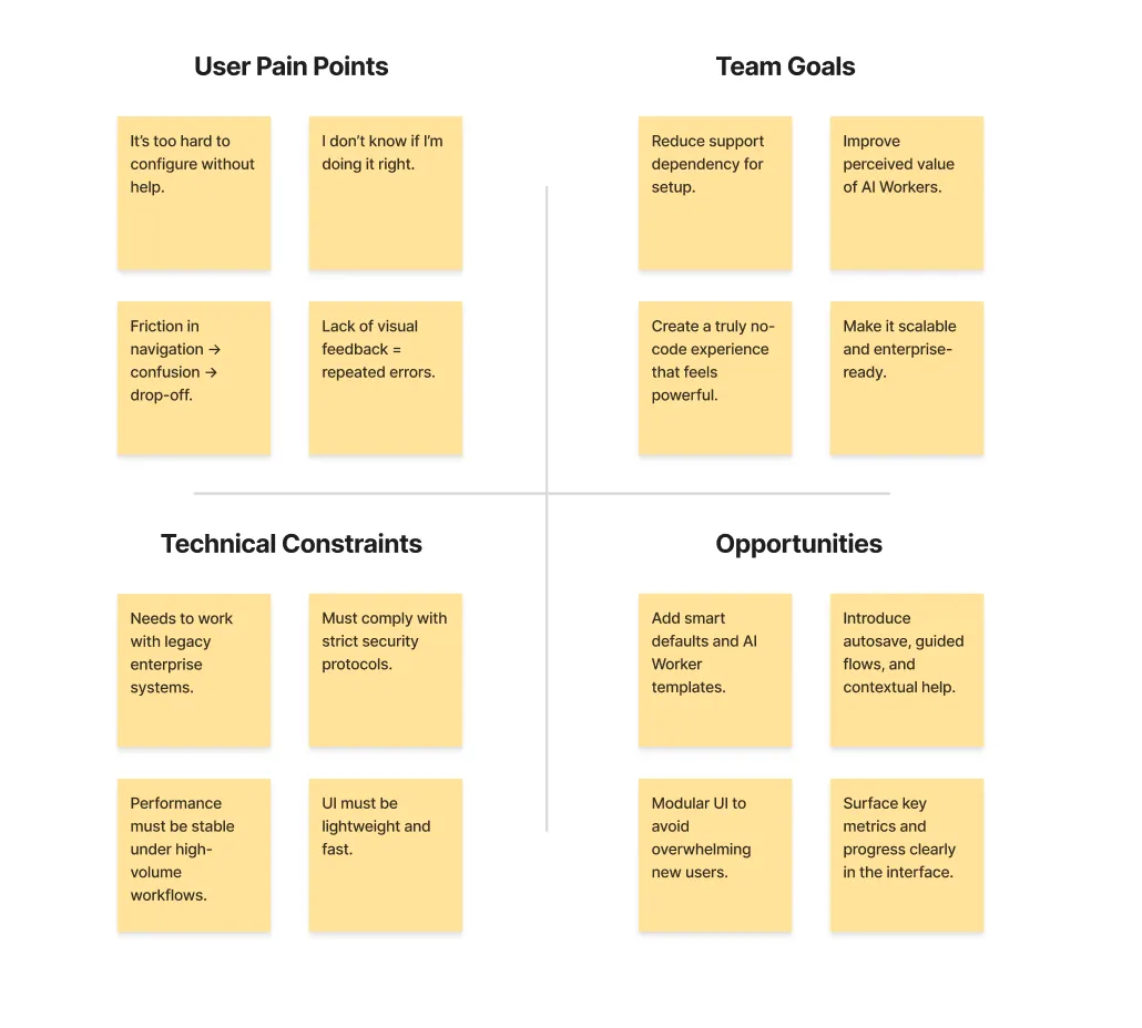 Complexity in Navigation — Users found it difficult to interact with and configure AI Workers due to a cluttered and unintuitive interface, leading to inefficiencies and frustration.