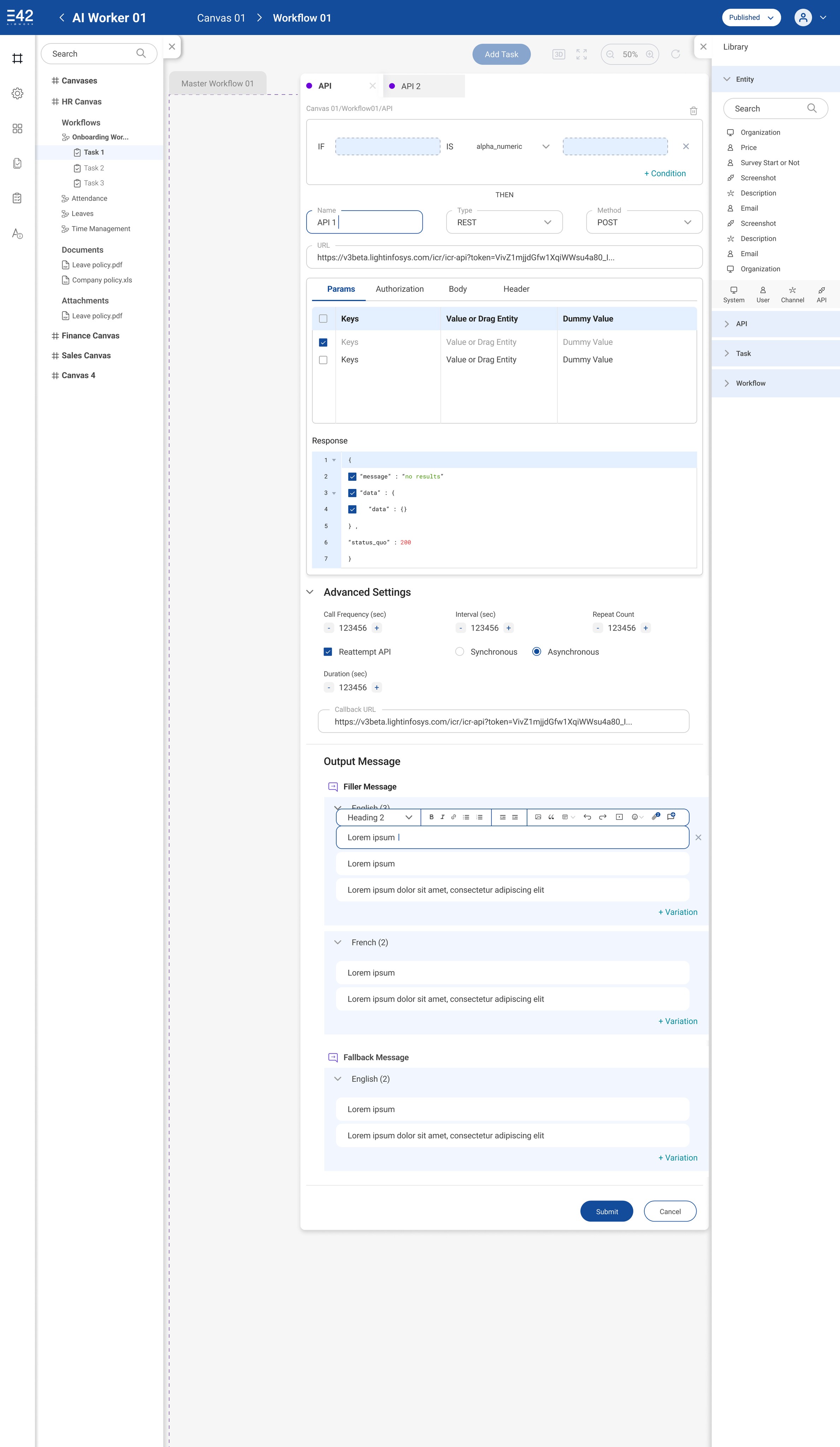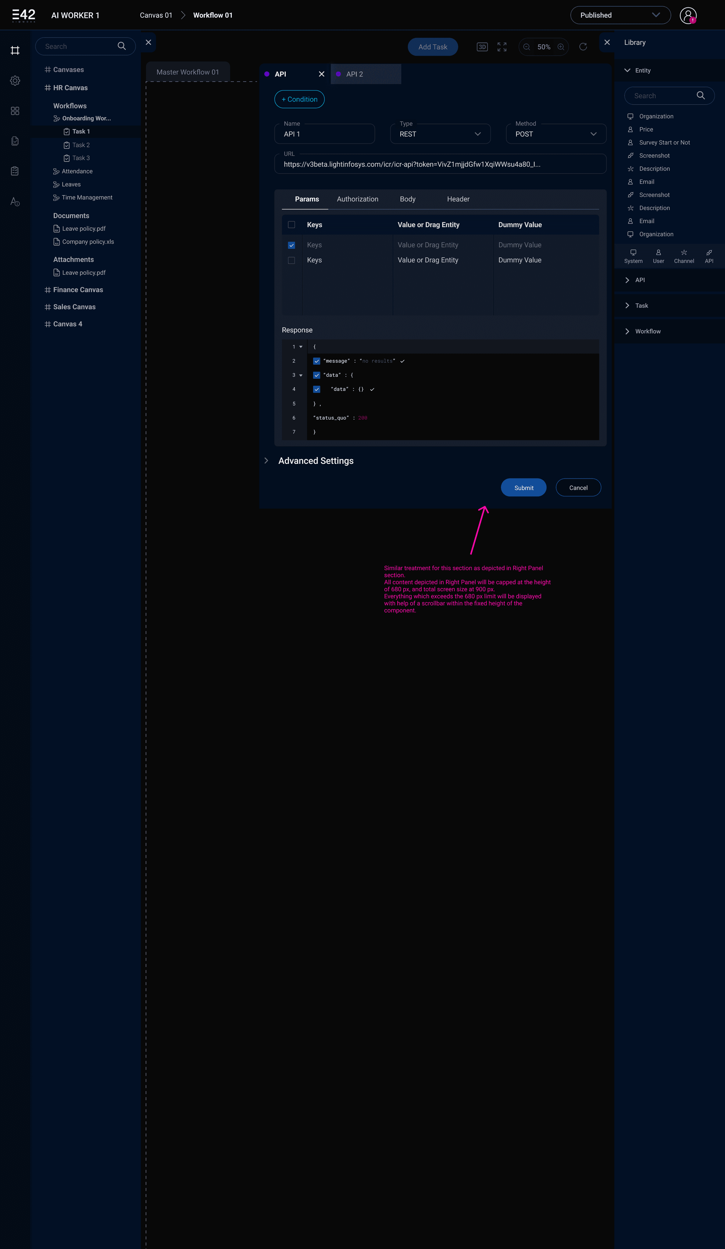 Right “Library” Panel: Quick access to reusable entities/APIs. Reduces redundancy.