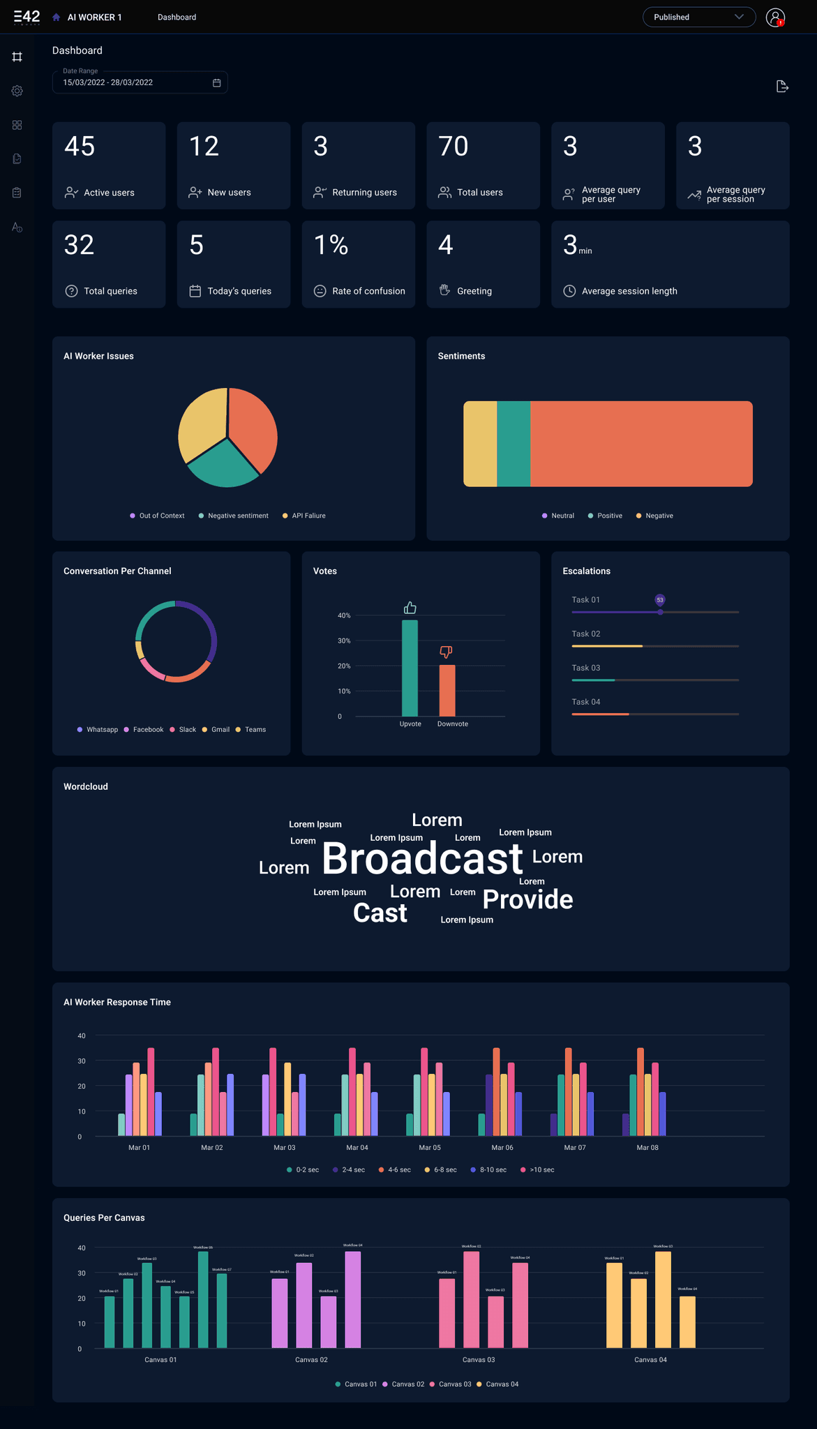 This screen presents a high-level overview of the AI Worker’s performance and key metrics at a glance. I wanted to give the user an immediate sense of the system’s health and activity.