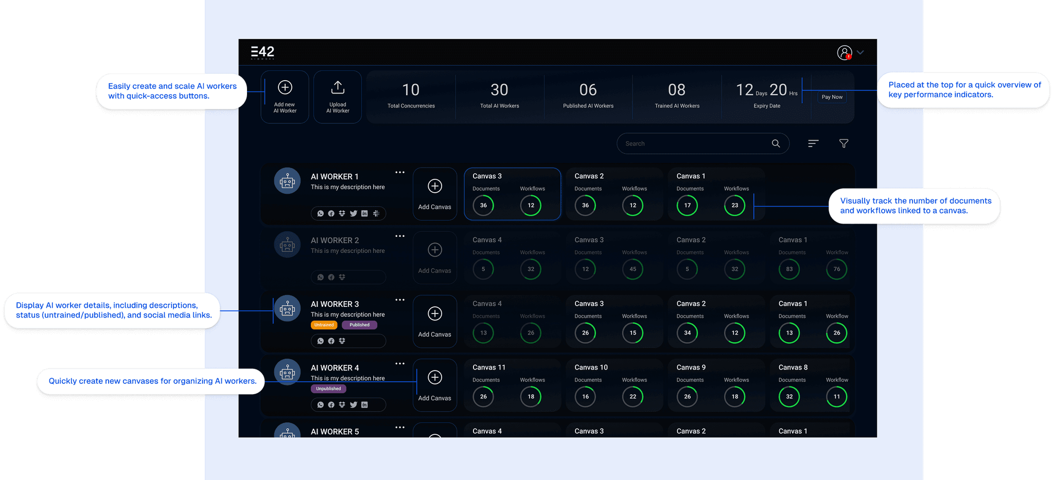 What are the most critical metrics users need to see immediately? This led to the placement of key metrics such as “Total Concurrencies,” “Total AI Workers,” “Published AI Workers,” “Trained AI Workers,” and “Expiry Date” at the top of the dashboard.